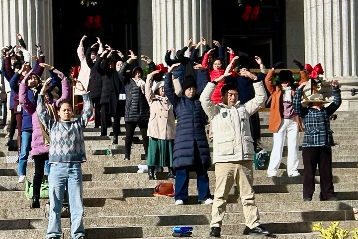 Practitioner Ms. He who works in New York said, “A man came to learn the exercises. Some people imitated our hand gestures. Some media influencers did live broadcasts. People across the street also took photos of us as we did the exercises.”