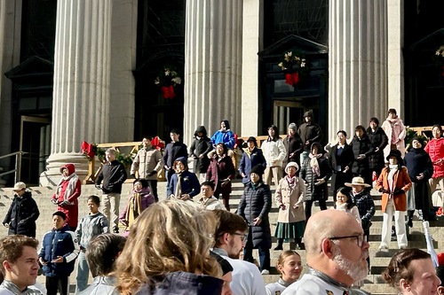 (Minghui.org) November 27, 2025, was Thanksgiving Day. The annual celebration was held in Manhattan, New York and drew many people. Falun Dafa practitioners held activities in front of the United States Post Office on Eighth Street to introduce the spiritual practice to the public. The post office is across from Penn Station, New York’s main intercity railroad station and the destination of the Macy’s Thanksgiving Day Parade.