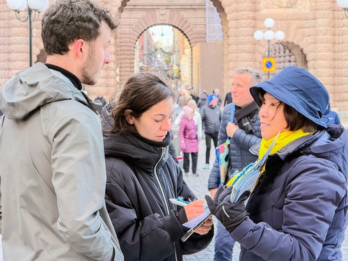 The Christmas Market near Stockholm’s Old Town opened in November. The practitioners’ event was located near the path to the Old Town and the Royal Palace, and crowds of tourists passed by. Some practitioners demonstrated the exercises while others talked with passers-by, distributed flyers, collected signatures, and raised awareness of the CCP’s persecution and its state-sanctioned forced organ harvesting.