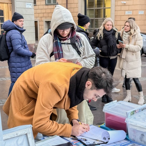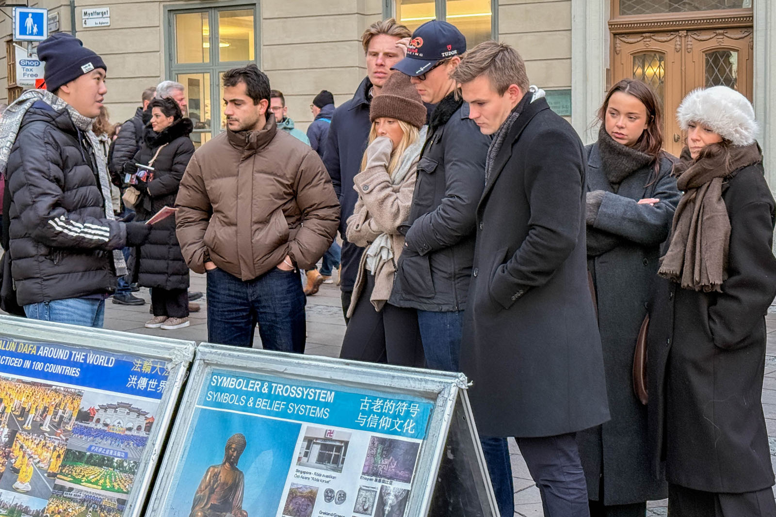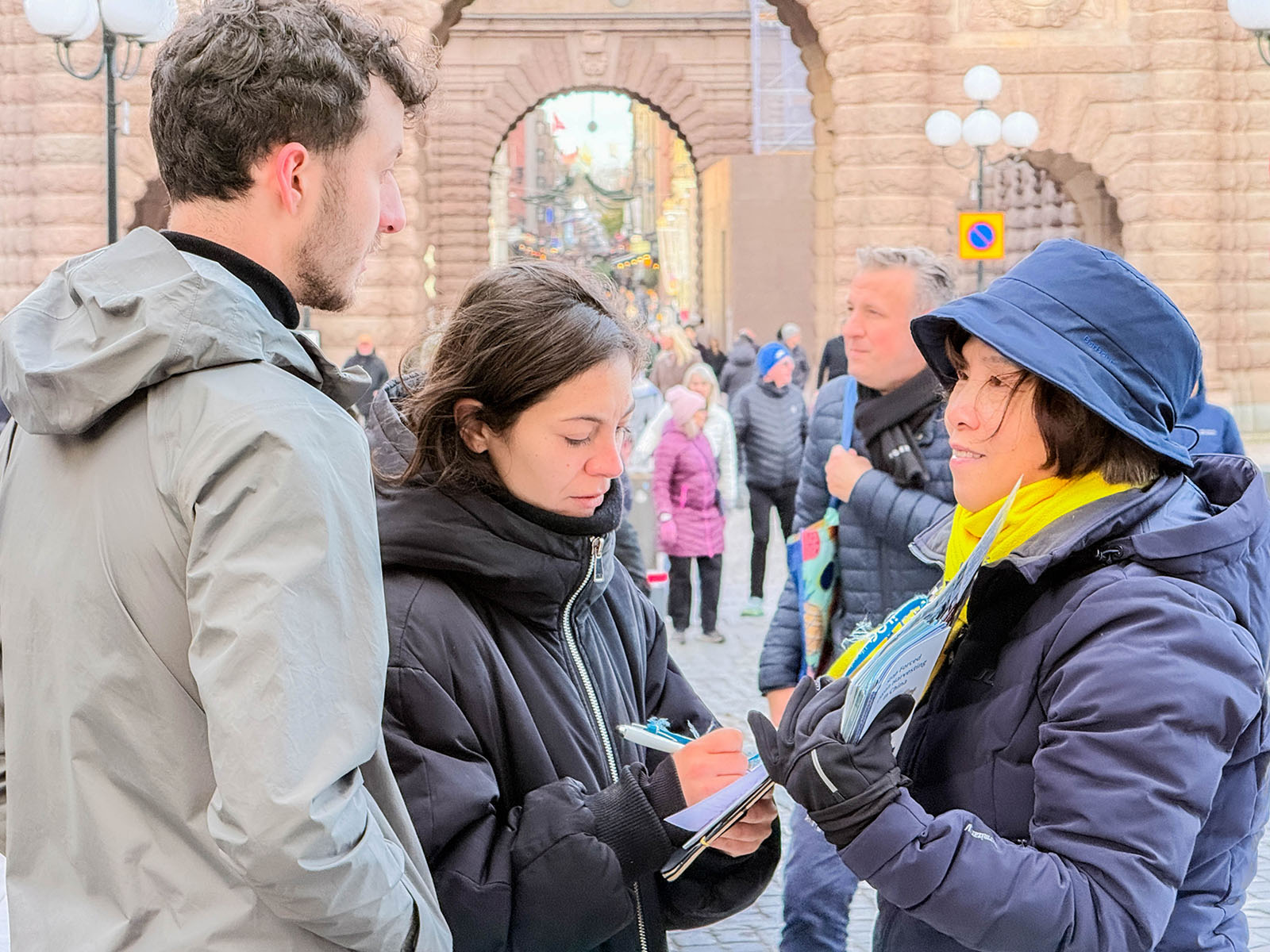 (Minghui.org) Falun Dafa practitioners held activities on Mynttorget near the Swedish Parliament Building on Fridays and Saturdays in November 2025. They demonstrated the exercises, raised awareness of the Chinese Communist Party’s (CCP) persecution, and collected signatures on a petition to end it. Many people signed the petition and said they admired the practitioners’ courage. Some Chinese tourists renounced their memberships in the CCP and its affiliated organizations during the events.