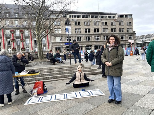 A German woman named Lisa stopped and watched a practitioner doing the exercises a short distance away, seemingly captivated. “The square was crowded and noisy. This woman stood here quietly, radiating a tranquility that was so different,” Lisa told a practitioner.