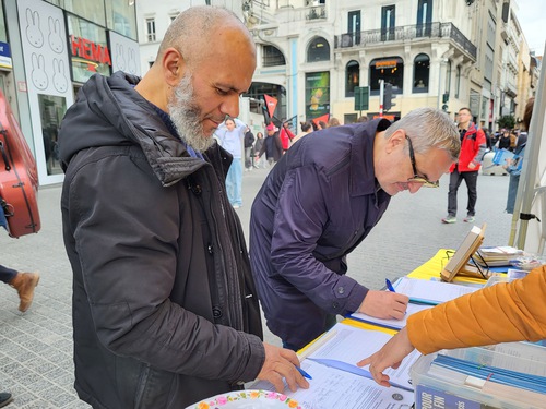 (Minghui.org) Practitioners held an event on a busy street in the center of Brussels, Belgium on March 22, 2025, to tell people about how the Chinese Communist Party (CCP) persecutes Falun Dafa. Practitioners displayed informational boards which introduced Falun Dafa’s core values of Truthfulness, Compassion, and Forbearance. They also demonstrated the exercises, distributed flyers, and described the brutal persecution practitioners suffer in China. Many people signed the petition to support ending the 25-year long persecution.