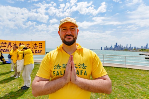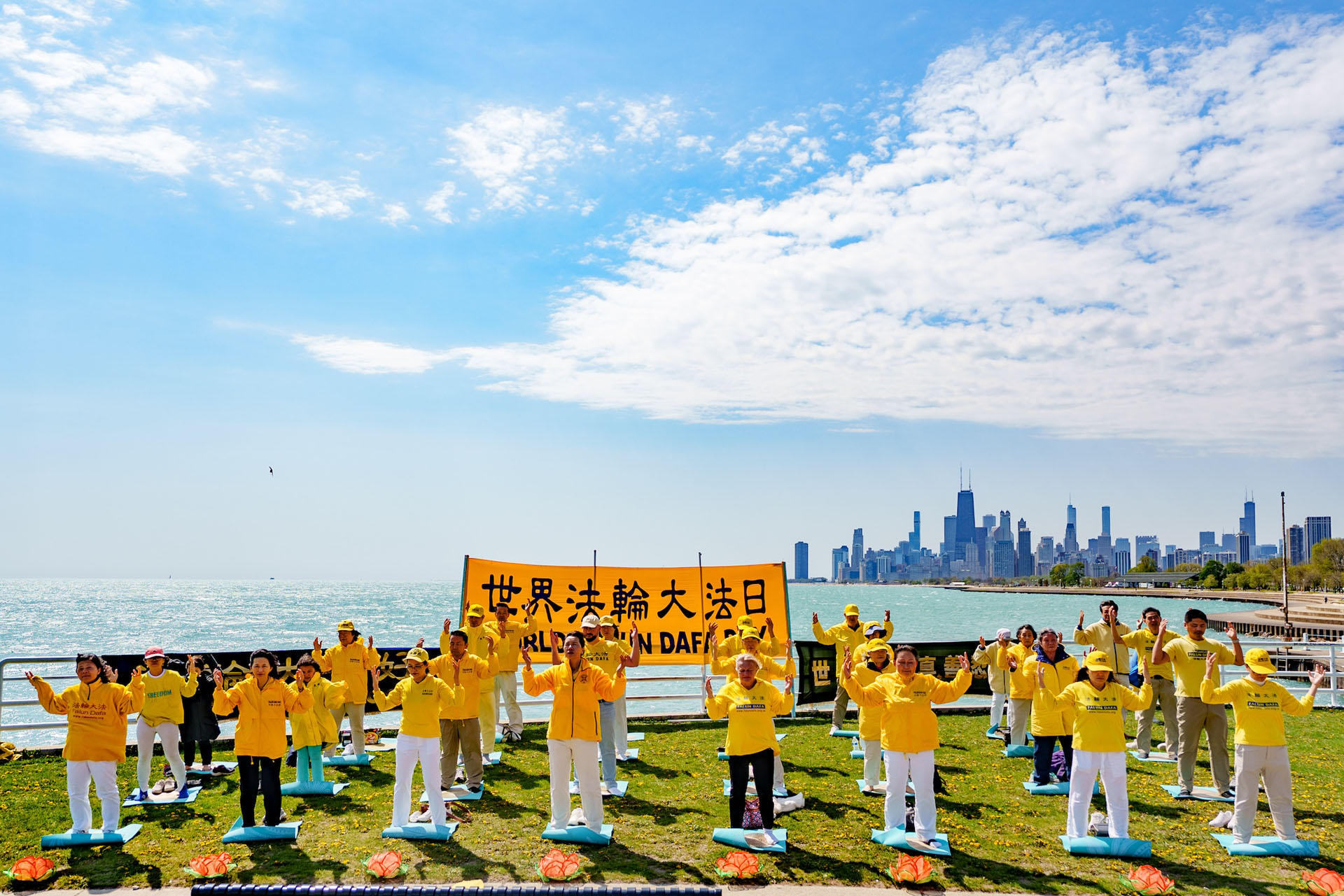 On May 10, 2025, Falun Dafa practitioners held an event by Lake Michigan in Chicago to celebrate World Falun Dafa Day and respectfully wish Master Li a happy birthday.