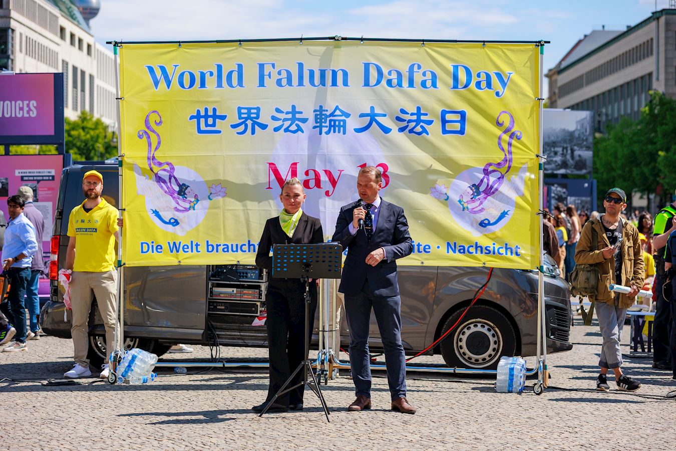 Performers gathered at Alexanderplatz in Berlin to celebrate World Falun Dafa Day.