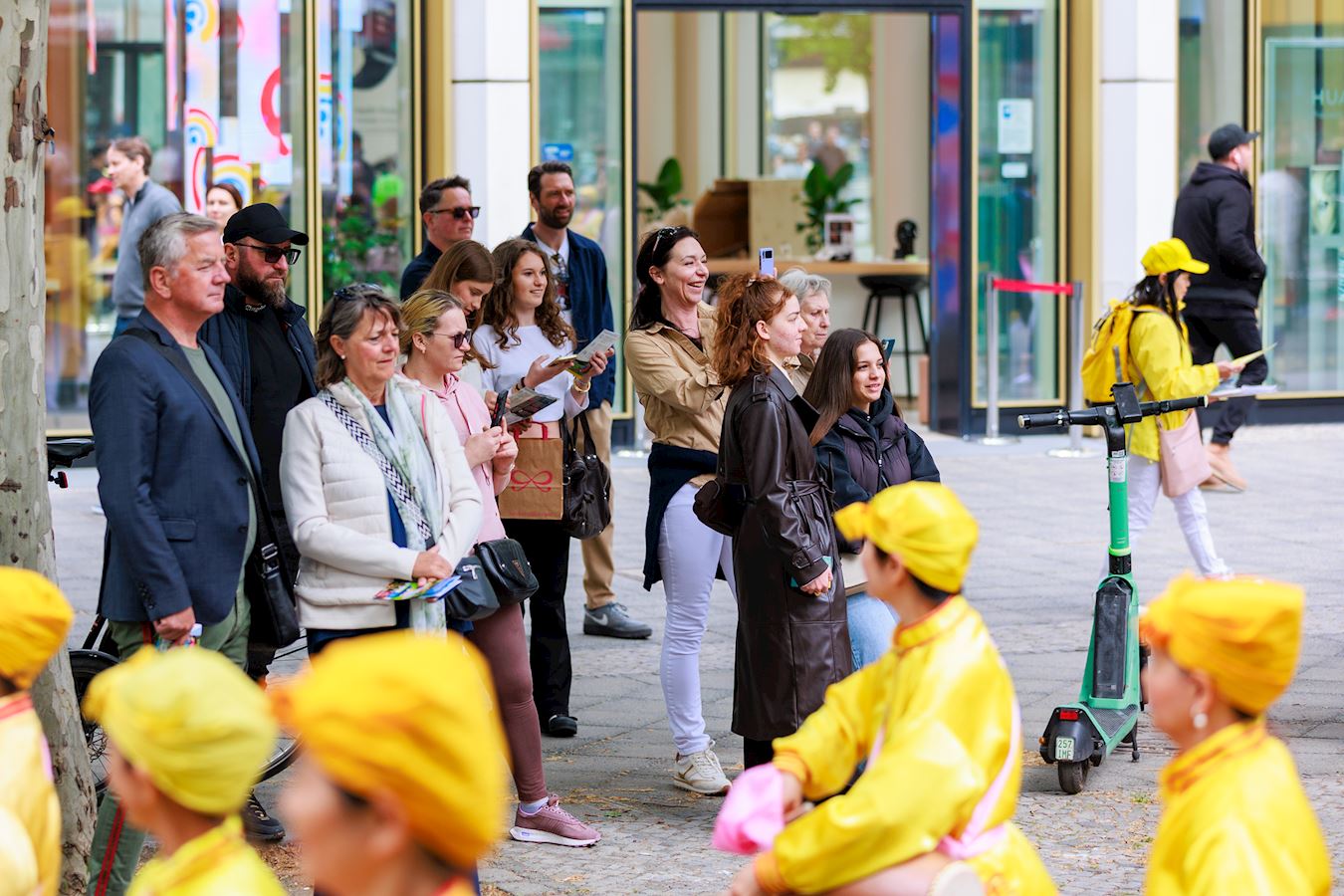 Many spectators were impressed by the beauty and peace conveyed by the cultivation practice Falun Dafa (also known as Falun Gong), and admired its principles of Truthfulness-Compassion-Forbearance. Many also condemned the Chinese Communist Party’s (CCP) persecution of Falun Gong practitioners in China. Some Chinese citizens who happened to be present even conveyed their support for Falun Dafa and their intention to withdraw their CCP memberships.