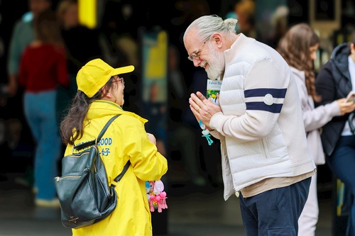 A passerby in his 60s told a Falun Dafa practitioner of his understanding of the principles Truthfulness-Compassion-Forbearance. “People must change themselves and try to help others. Despite running into many unpleasant situations in the past, I have always done so. Usually when people encounter problems, they will turn to others or ask politicians for help. In fact, I believe people must improve and follow the principles of Truthfulness-Compassion-Forbearance.”