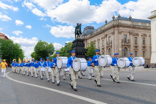 (Minghui.org) German Falun Dafa practitioners met and held parades in the German capital Berlin on May 9-10, 2025. They celebrated the 26th World Falun Dafa Day and founder Master Li Hongzhi’s birthday. The large-scale event involved performances by the European Tian Guo Marching Band, the Polish Dragon Dance Team, and the German Waist Drum Team.