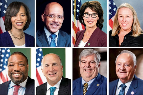 Top row from left: Lisa Blunt Rochester, Senator from Delaware; Vicent Hughes, Senator from Pennsylvania; Mary Isaacson and Mandy Steele, members of House of Representatives from Pennsylvania; Bottom row from left: Kenyatta Johnson, Council President of the Philadelphia City Council; Mark Squilla, a city council member; Patrick J. Catena, County Executive of Allegheny County, Pennsylvania; and Bob Macey, a county council member.