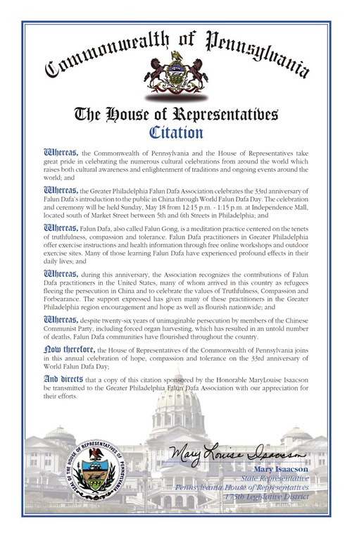 “And directs that a copy of this citation sponsored by the Honorable MaryLouise Isaacson be transmitted to the Greater Philadelphia Falun Dafa Association with our appreciation for their efforts.”