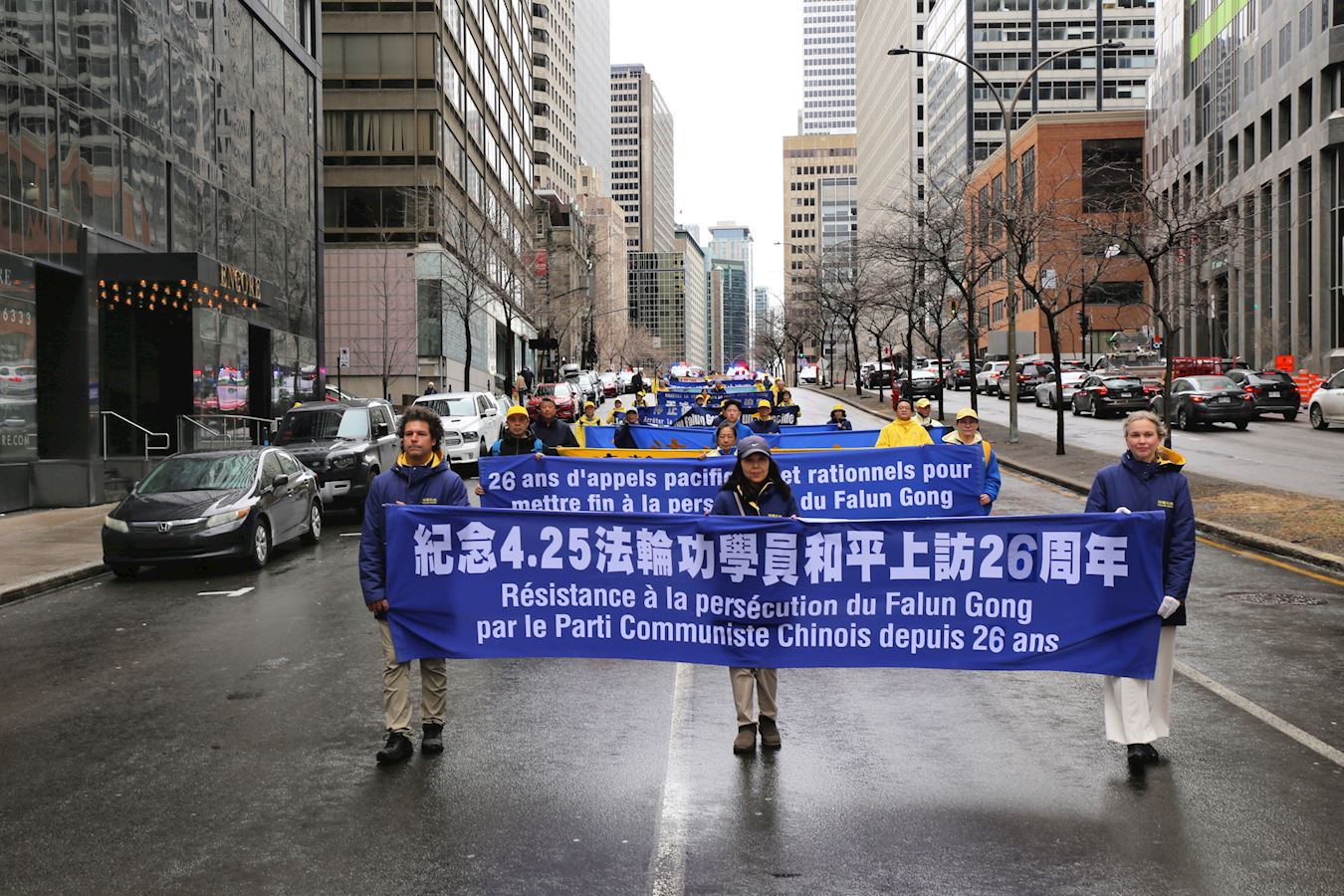 (Minghui.org) Practitioners in Québec, Canada held a parade in Montreal on the afternoon of April 27, 2025, to commemorate the peaceful appeal in Beijing on April 25, 1999, and calling for an end to the Chinese Communist Party’s (CCP) persecution of Falun Dafa.