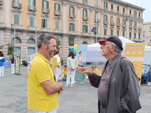 (Minghui.org) In celebration of World Falun Dafa Day and to wish their founder, Master Li Hongzhi, a happy birthday, Dafa practitioners from all over Italy held group exercises and activities at Napoli’s city hall on May 11, 2025. Located in the south of Italy, Napoli is Italy’s third largest city, and the most densely populated city in Europe.