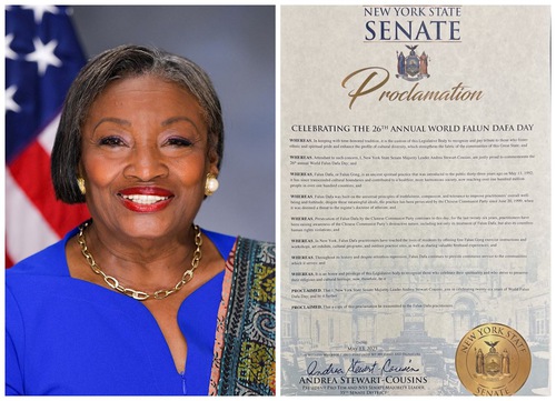 “PROCLAIMED. That I, New York State Senate Majority Leader Andrea Stewart-Cousins, join in celebrating twenty-six years of World Falun Dafa Day.”
