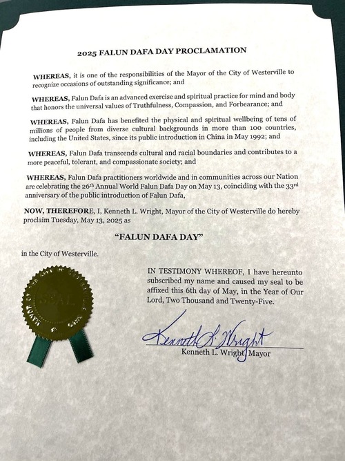 “NOW, THEREFORE, I, Kenneth L. Wright, Mayor of the City of Westerville do hereby proclaim Tuesday, May 13, 2025 as "FALUN DAFA DAY" in the City of Westerville.”