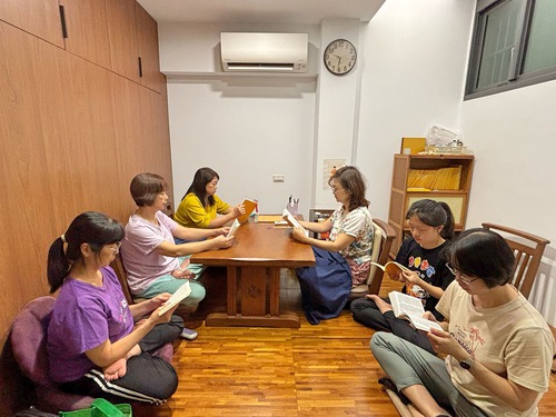 Zishan (second from right), Ping Yun (left), and other family members study the Fa together every week.