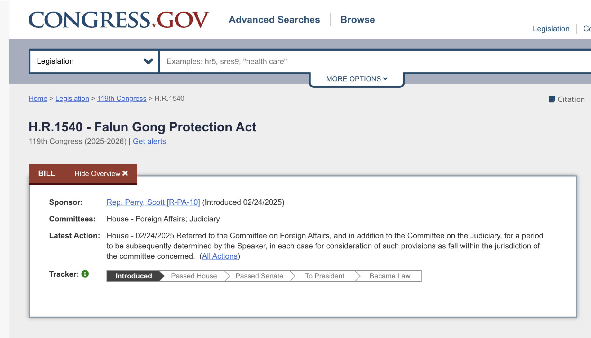 Screenshot of the official web page of the Falun Gong Protection Act: https://www.congress.gov/bill/119th-congress/house-bill/1540
