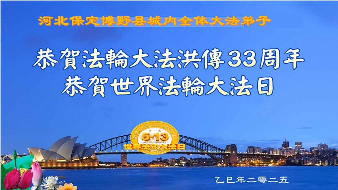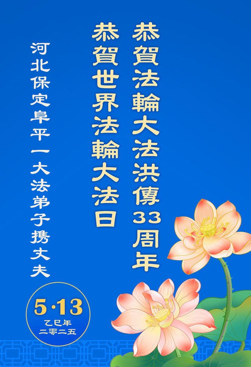 (Minghui.org) In this report, we present a selection of the 18 greetings sent from Falun Dafa practitioners in Baoding City, Hebei Province, China, to celebrate the special occasion of May 13, 2025: the 26th World Falun Dafa Day and the birthday of Master Li Hongzhi.