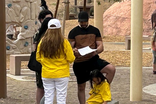 (Minghui.org) Practitioners in Las Vegas held an event at Exploration Peak Park on the afternoon of May 3, 2025, to celebrate World Falun Dafa Day. They demonstrated the exercises and told people about Falun Dafa. World Falun Dafa Day is on May 13, and this year marks the 33rd anniversary of Falun Dafa’s introduction. They also sent their best wishes to their founder, Mr. Li Hongzhi, and wished him a happy birthday.