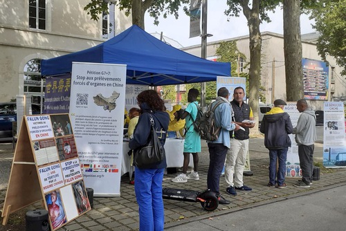 Falun Dafa practitioners held a truth-clarifying tour event at the Piazza Napoleone in La Roche-sur-Yon on June 7, 2025.