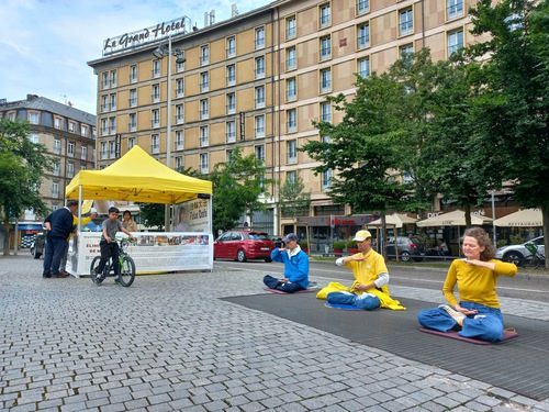 Practitioners held an information day event on the square in front of Strasbourg’s train station, the second largest in the country, on Sunday, May 25. They hung banners and set out display boards with photos and information about the practice of Falun Gong and the CCP’s persecution of the practice in China.