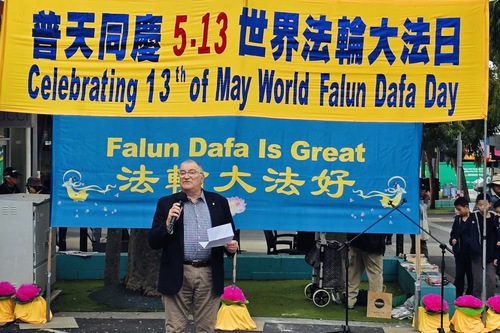 Whitehorse city councilor Blair Barker first conveyed greetings from Whitehorse Mayor Andrew Davenport during his speech on May 31. Barker said that over the years he’s become familiar with Falun Dafa, and he also visited practitioners at the group practice site in Box Hill Gardens many times. He feels that practicing the exercises helps remove negative energy and allows one to embrace life.