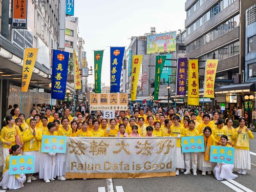 The Kanazawa Hyakumangoku Festival is the largest annual festival in Kanazawa, drawing more than 400,000 visitors each year. The festival organizer introduced Falun Dafa (also known as Falun Gong): “Falun Dafa is based on the principles of Truthfulness, Compassion, and Forbearance. It is a traditional Chinese qigong practice method that improves morality and purifies the body and mind.”