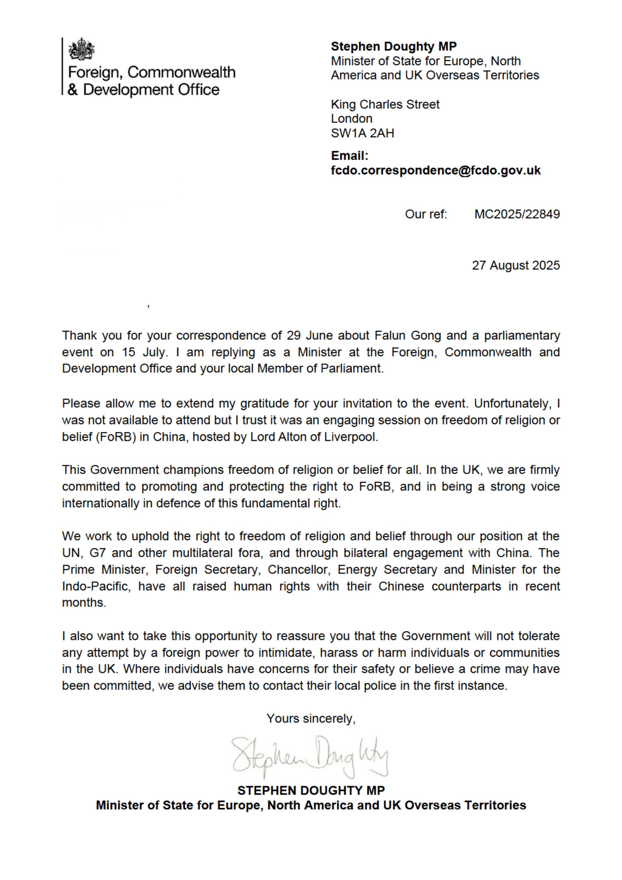 Stephen Doughty MP sent a letter to support Falun Gong practitioners’ right to freedom of belief.