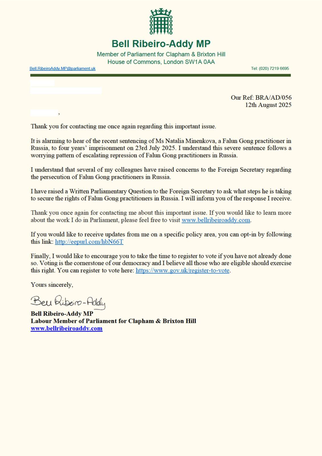 Bell Ribeiro-Addy MP said, “It is alarming to hear of the recent sentencing of Ms Natalia Minenkova, a Falun Gong practitioner in Russia, to four years’ imprisonment on 23rd July 2025. I understand this severe sentence follows a worrying pattern of escalating repression of Falun Gong practitioners in Russia.