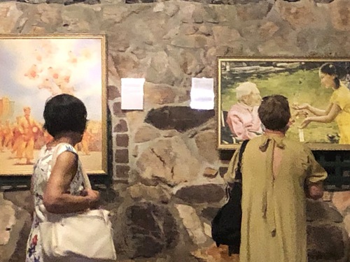 A young couple silently admired the paintings, reading the explanations for each canvas.