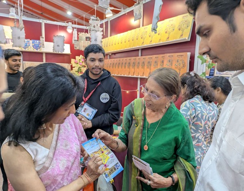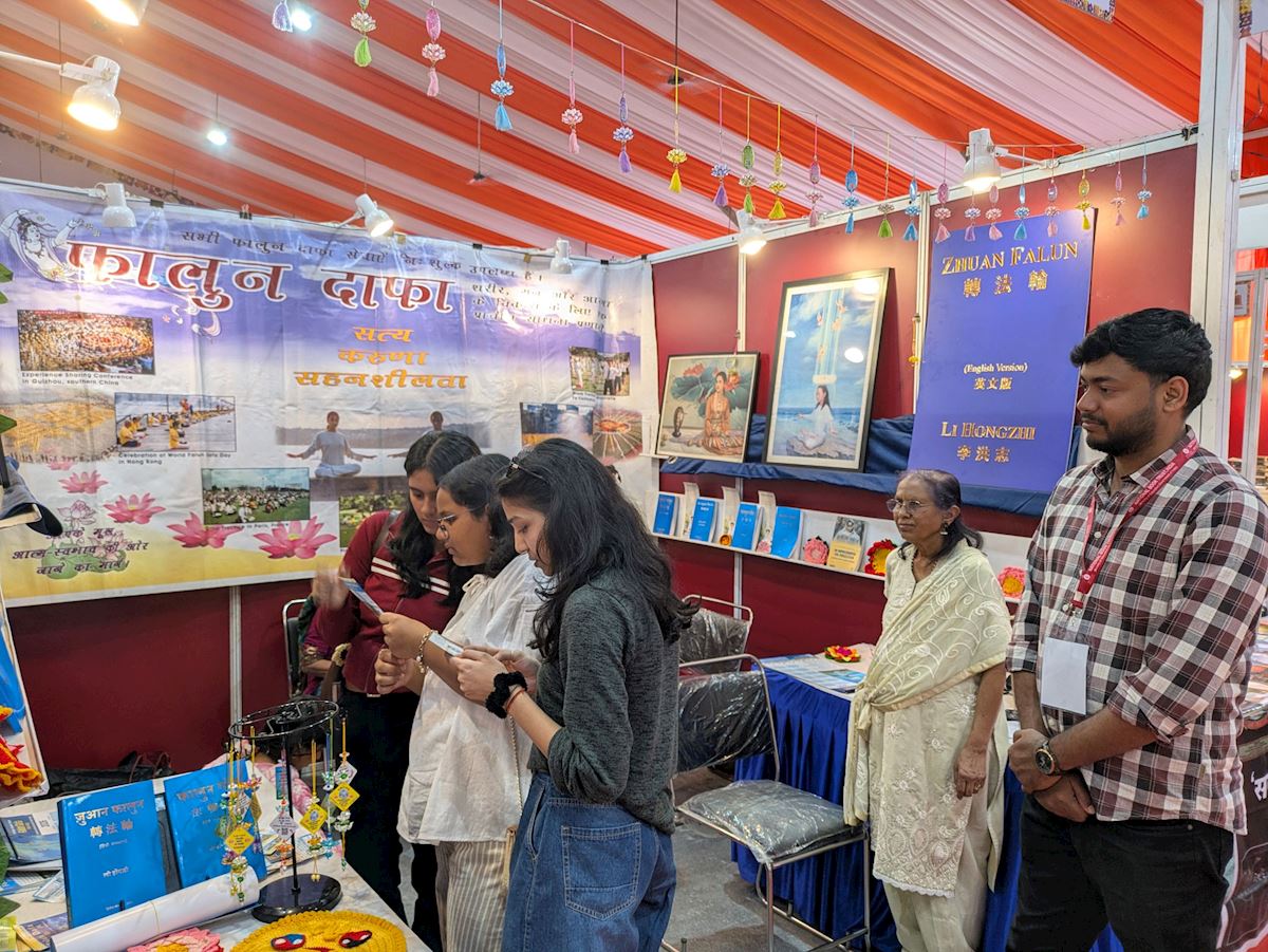 Practitioners displayed Falun Dafa books such as Zhuan Falun and Falun Gong, and some works of art from the Art of Zhen, Shan, Ren International Exhibition. Numerous book lovers and professionals from schools, colleges, the medical community, professional groups, spiritual groups, and political circles, stopped at the Falun Dafa booth to learn more. Many were impressed when they were told that Falun Dafa is taught free of charge by volunteers worldwide. A large number of visitors expressed great interest in the online volunteer-led classes in India and purchased Falun Dafa books in English, Hindi, and Marathi.
