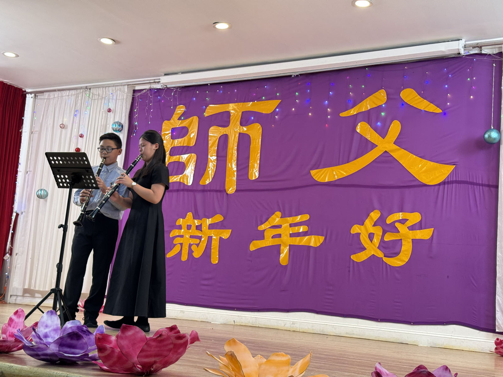 The warm and inviting atmosphere contrasted with the winter cold outside. The stage was decorated with flowers, and colorful lights highlighted a banner that read: “Happy New Year, Master.” The venue was packed with practitioners from different ethnic backgrounds. Ranging in age from 90 to just a few years old, from veteran practitioners to newcomers, they respectfully exclaimed in unison, “We wish Master a Happy New Year! Falun Dafa is good! Truthfulness-Compassion-Forbearance is good!”