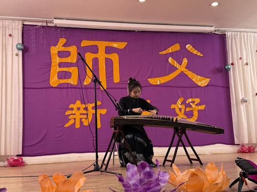 A festive lion and dragon dance signaled the start of the performances, followed by poetry recitations, solo singers, dancers, waist drums, taiko drums, and martial arts performances. Musicians played various instruments such as the guzheng, erhu, pipa, clarinet, cello, and violin. The event ended with a rousing rendition of “Falun Holy King,” “Giving You a Path of Hope,” and “Falun Dafa Is Good” by everyone present.