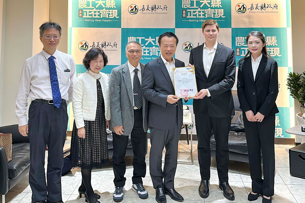 On January 20, Chiayi County Magistrate Weng Chang-liang (third from right) presented a certificate of appreciation to Shen Yun’s emcees on behalf of the county government, thanking Shen Yun for bringing a world-class artistic experience to audiences in southern Taiwan.