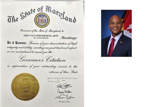 The citation reads, “Governor of the State of Maryland, to SHEN YUN PERFORMING ARTS 20h ANNIVERSARY.