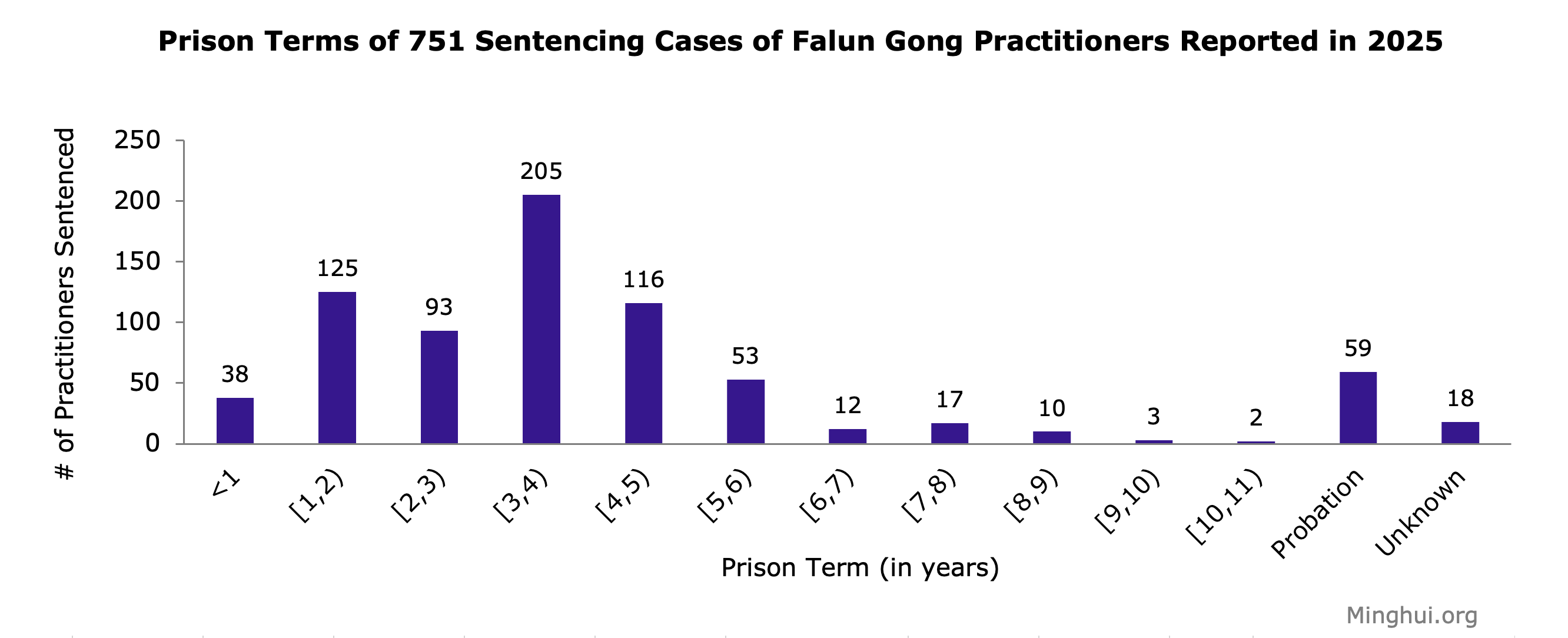 The Chinese Supreme People’s Procuratorate announced in February 2024 that in recent years, 85% of convicted criminals received three years or less, compared to 55% in 1999. Yet for the 751 sentencing cases of Falun Gong practitioners reported in 2025, 418 of them (55.7%) were sentenced to three to ten years, signifying a more severe sentencing of Falun Gong practitioners, when they violated no laws in exercising their constitutional right to freedom of belief in the first place.