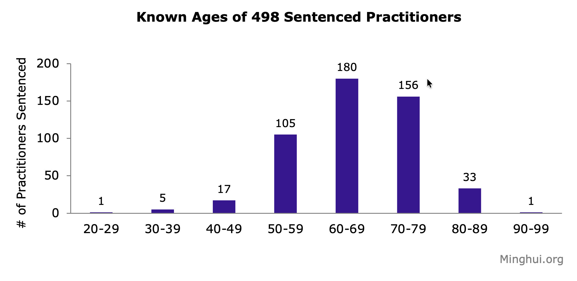Among 498 out of the 751 practitioners whose ages at the time of their sentencing were known, 1 was in her 20s, 5 in their 30s, 17 in their 40s, 105 in their 50s, 180 in their 60s, 156 in their 70s, 33 in their 80s, and 1 in her 90s.