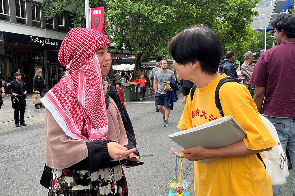 Practitioners talk with visitors about Falun Dafa and the CCP’s persecution.