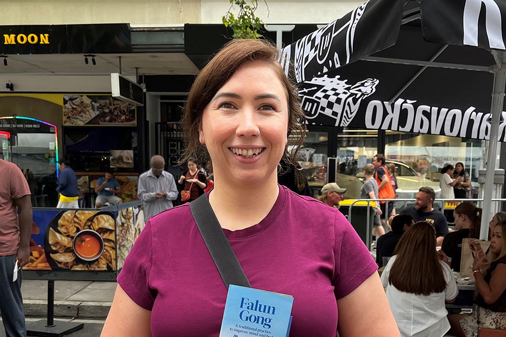 Rebecca White said she knew a little bit about Falun Dafa: “It’s based on Truthfulness, Compassion, and Forbearance. Its exercise movements are slow, and they help you find inner peace and be a better person.”
