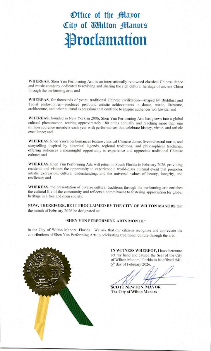 (Minghui.org) To welcome Shen Yun which is scheduled to perform on February 17 and 18, 2026, Mayor Scott Newton of Wilton Manors, Florida issued a proclamation on February 5, 2026, designating February Shen Yun Performing Arts Month in the city.