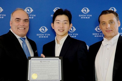 Steve Babick (left), the mayor of Carrollton, presented a proclamation to Shen Yun artists at the Eisemann Center in Dallas on February 10. (Screenshot courtesy of NTD)