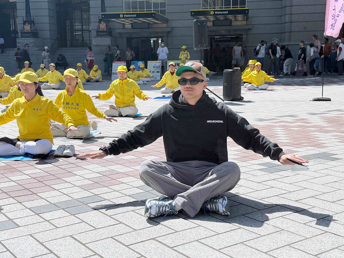 Imogen Staines works near Commercial Bay, and said she was attracted by the scene of practitioners doing the exercises. She explained that meditating relieved her anxiety and helped her calm down.