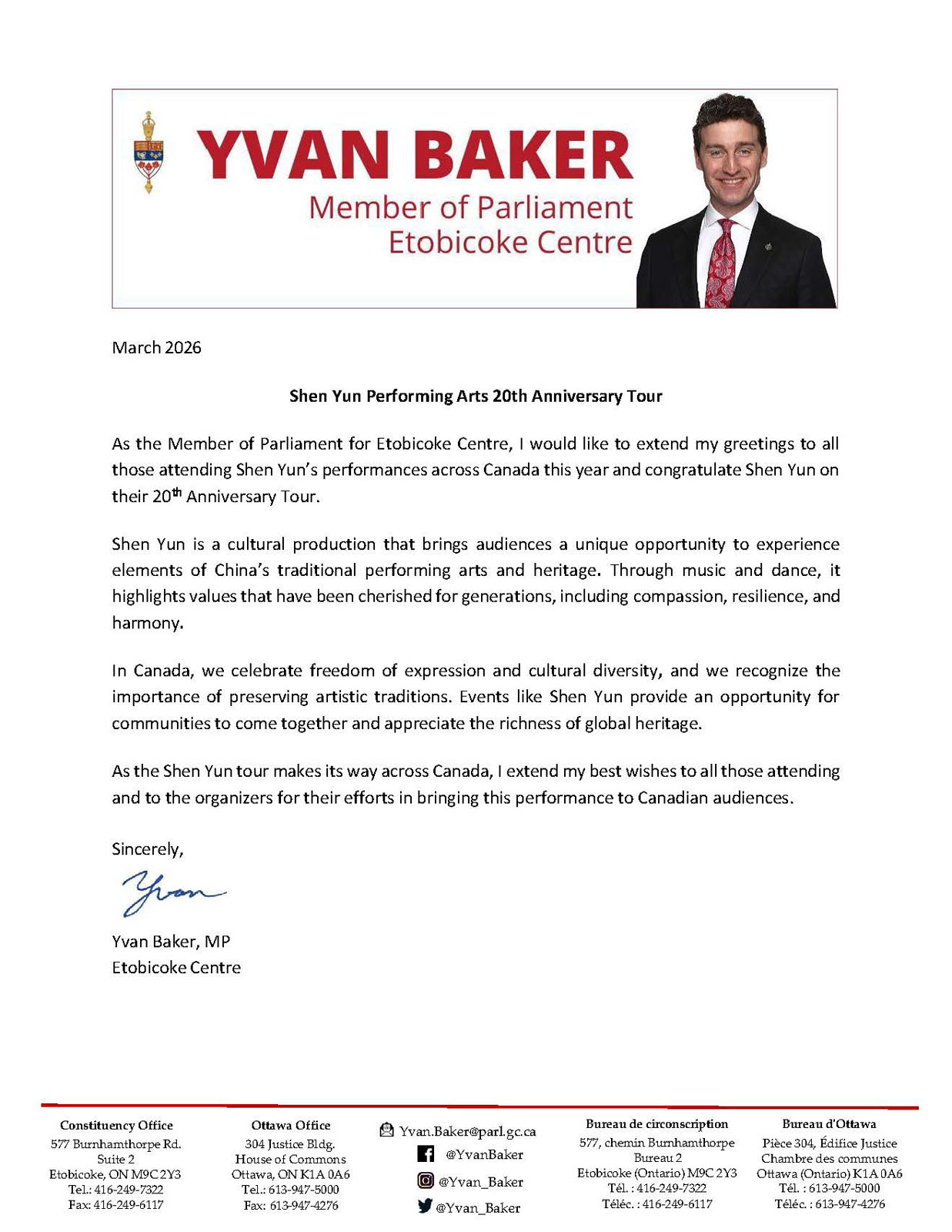 “In Canada, we celebrate freedom of expression and cultural diversity, and we recognize the importance of preserving artistic traditions,” MP Yvan Baker stated in his congratulatory letter. “Events like Shen Yun provide an opportunity for communities to come together and appreciate the richness of global heritage.”