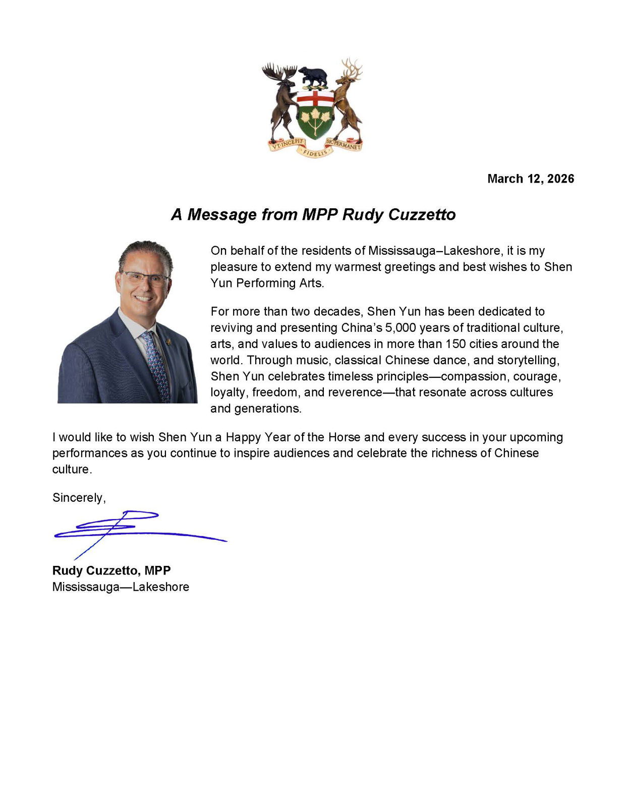 Ontario MPP Rudy Cuzzetto sent a congratulatory letter praising Shen Yun. (The Epoch Times)