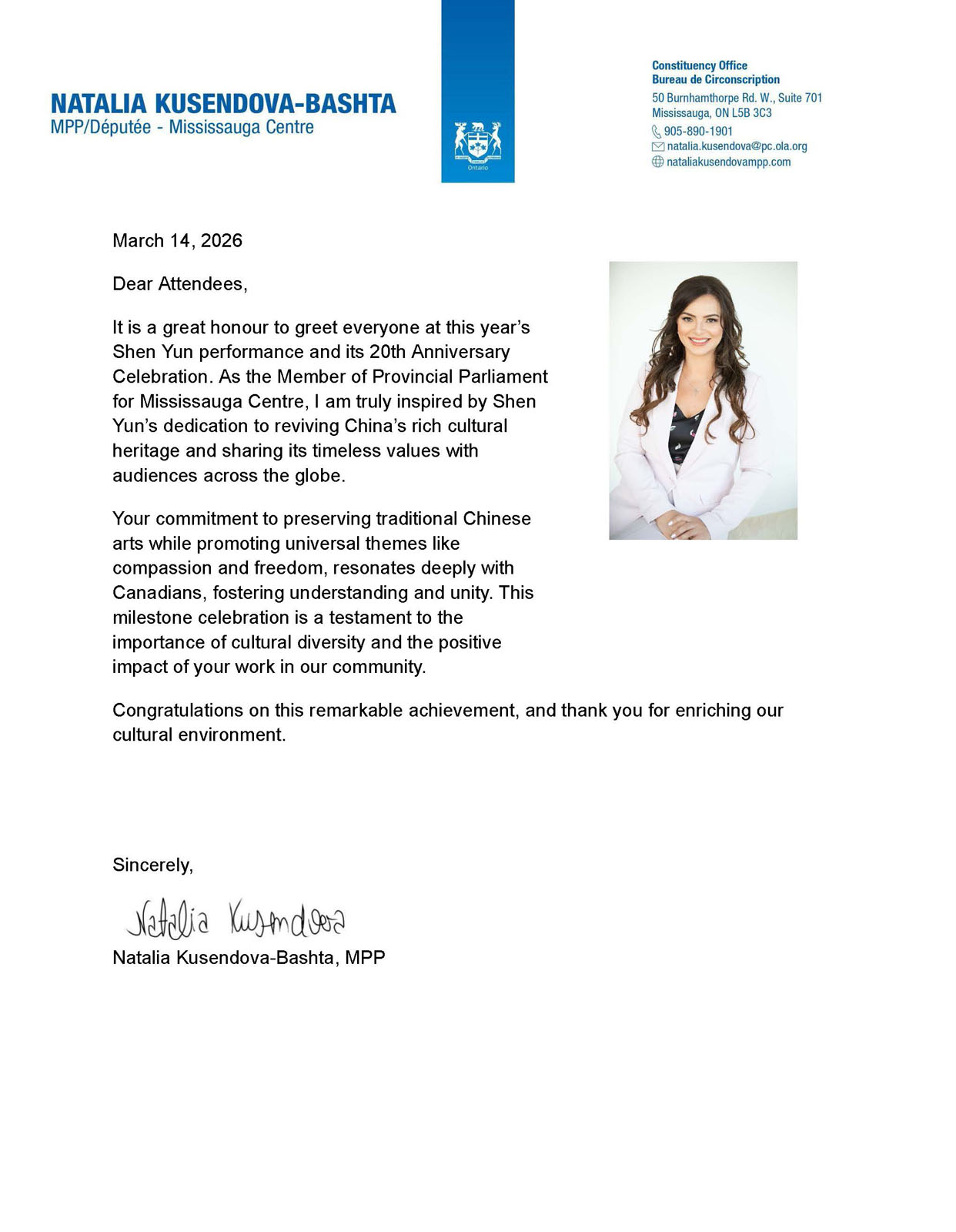 In her congratulatory letter, Ontario MPP Natalia Kusendova-Bashta wrote, “I am deeply moved and inspired by Shen Yun’s efforts to revive China’s long-standing cultural heritage and convey its enduring values to a global audience.”