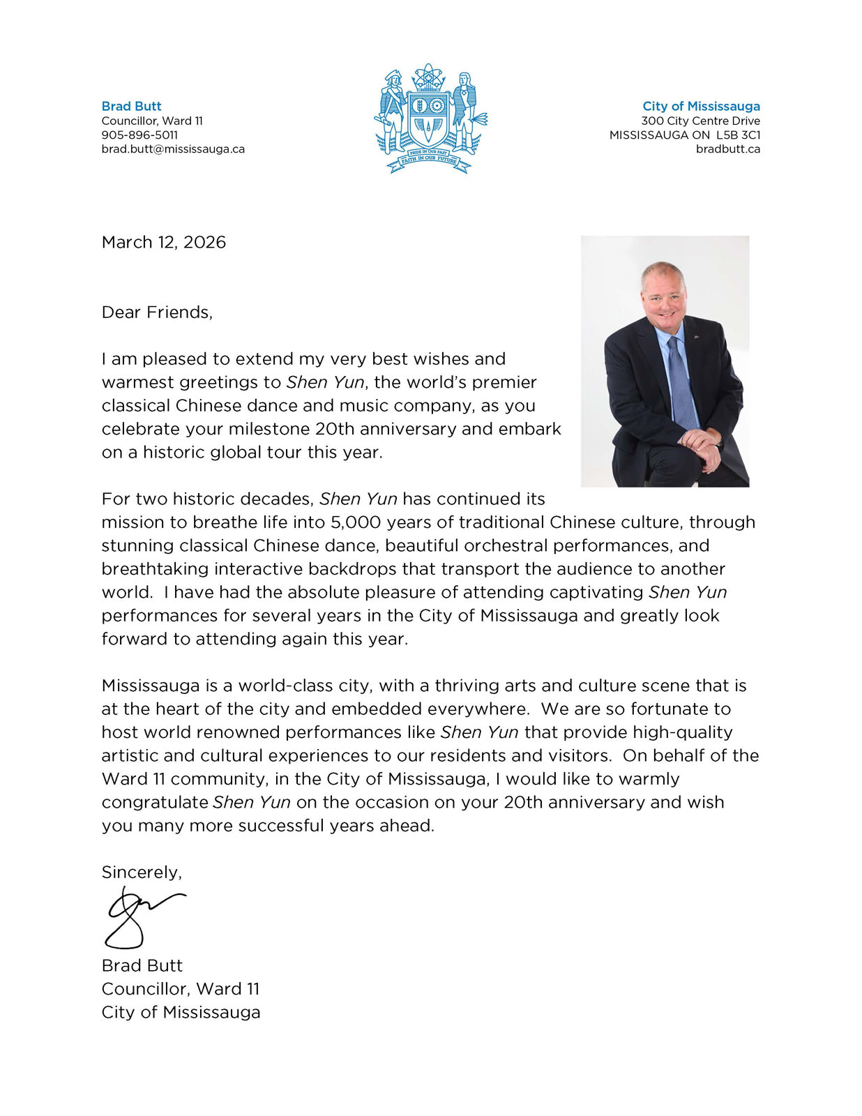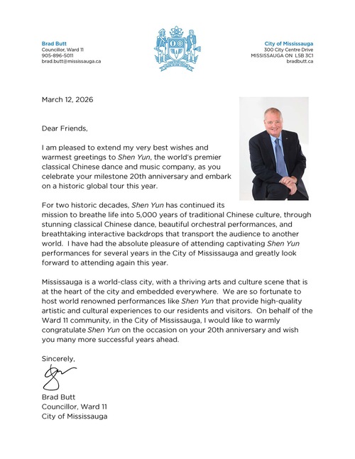 Mississauga Councilor Brad Butt said he has had the pleasure of attending Shen Yun performances for several years in his city, and he looks forward to attending again this year.