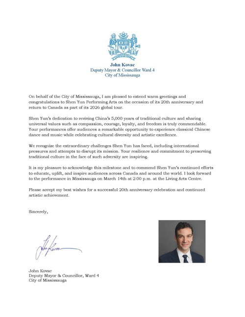 Mississauga Deputy Mayor and Councilor John Kovac said Shen Yun’s resilience and commitment to preserving traditional culture in the face of international pressures and attempts to disrupt its mission is “inspiring.”