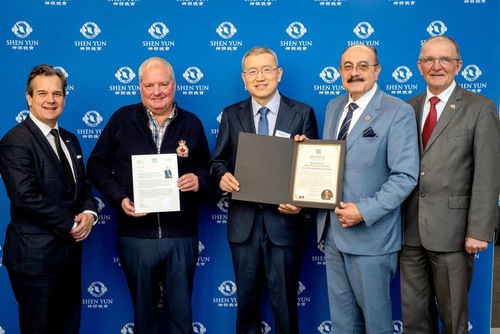 On the afternoon of March 14, 2026, Ontario MPP Sheref Sabawy (second from right) presented an award to Shen Yun at the theater and watched the performance. Other officials in the photo are: Mississauga City Councilor Stephen Dasko (first from left), Mississauga City Councilor Brad Butt (second from left), and former Member of Parliament Wladyslaw Lizon (first from right). (The Epoch Times)