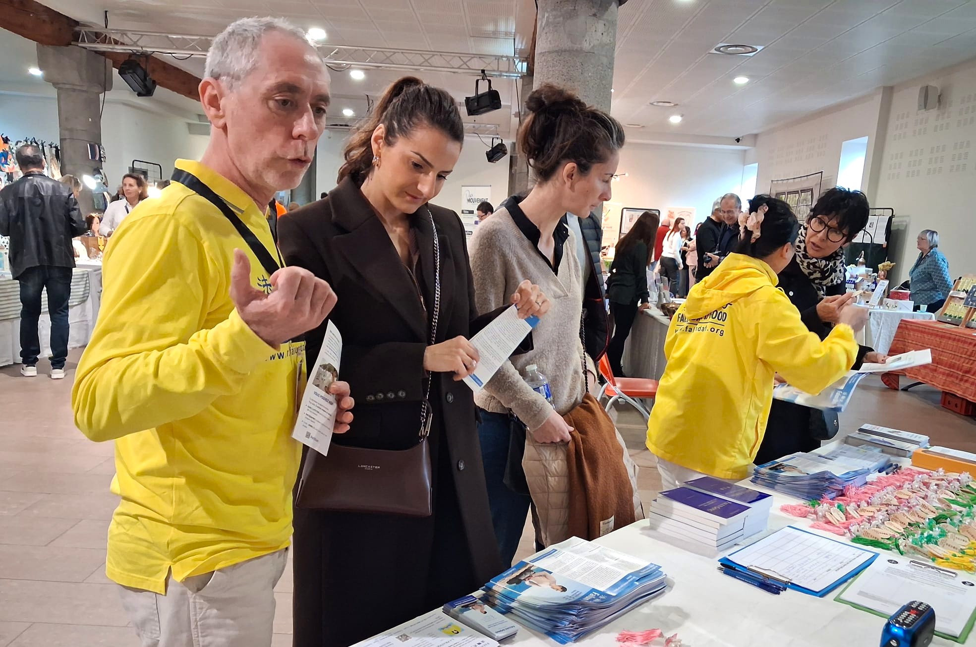 Mayor Sébastien Frey came to the Falun Dafa booth and talked to practitioners. When he learned the principles of the practice are truthfulness, compassion, and forbearance, he said, “These values should be promoted to the general public. If everyone abided by Truthfulness, Compassion, and Forbearance, the world would be a better place, and our lives would be much easier.”