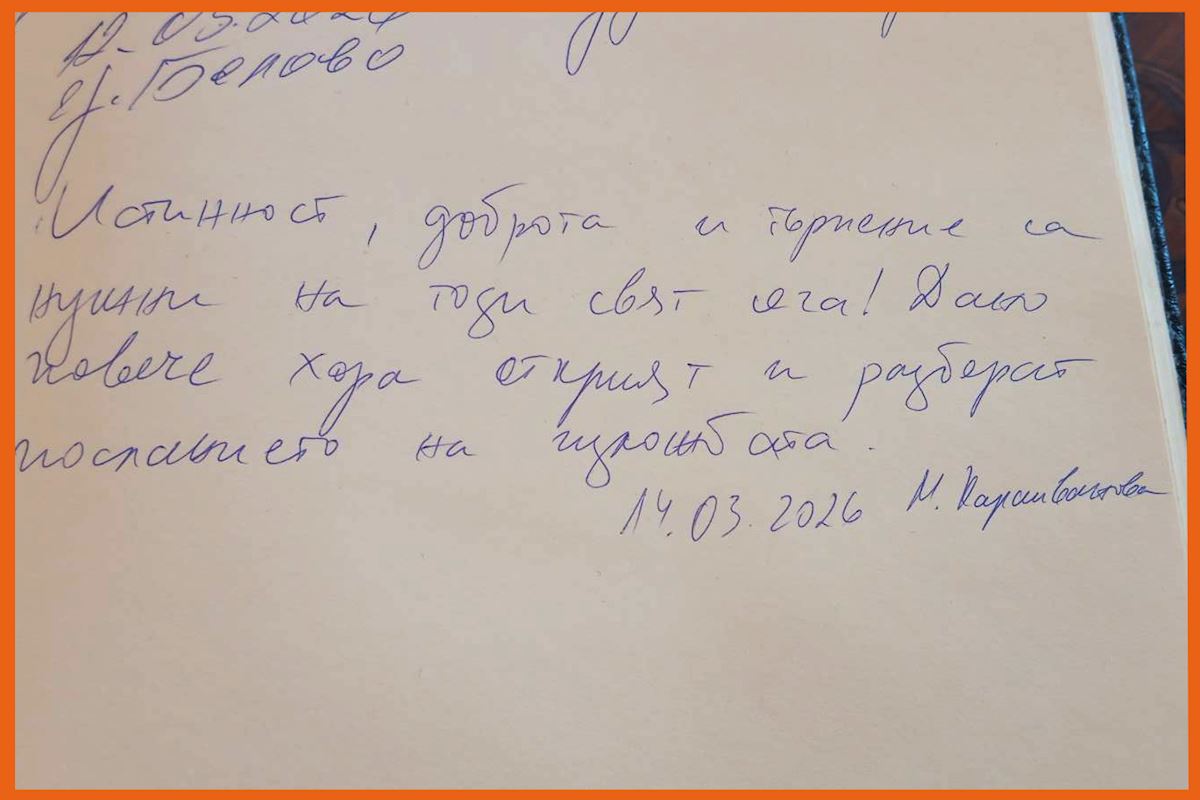 Maria Karaivanova, an educator who owns a private school in Sofia, was impressed by the positive moral values espoused by the artists. “Truthfulness, Kindness, and Forbearance are needed in this world right now!” she wrote in the guestbook. “May more people discover and come to understand the message of the exhibition!”