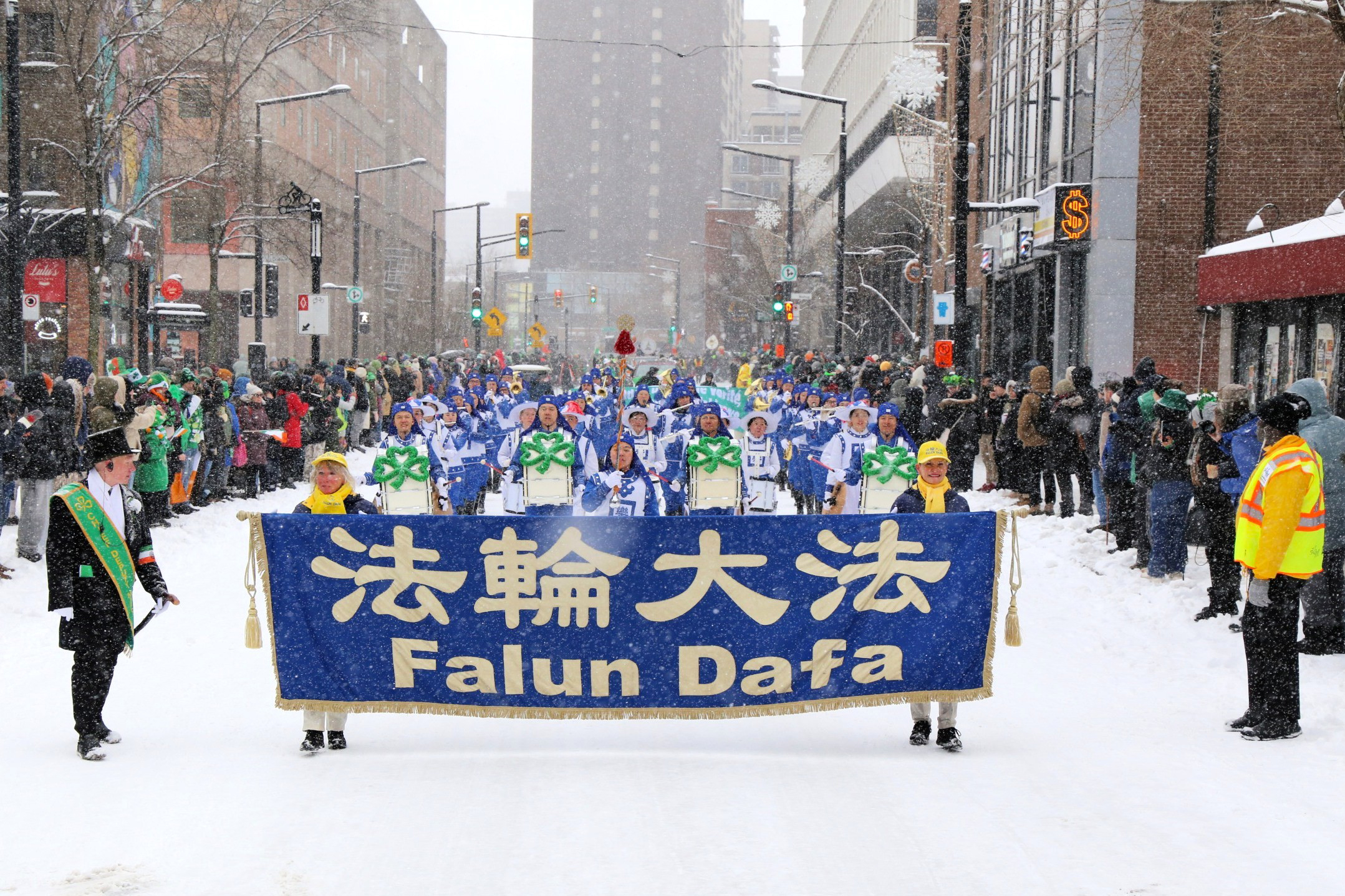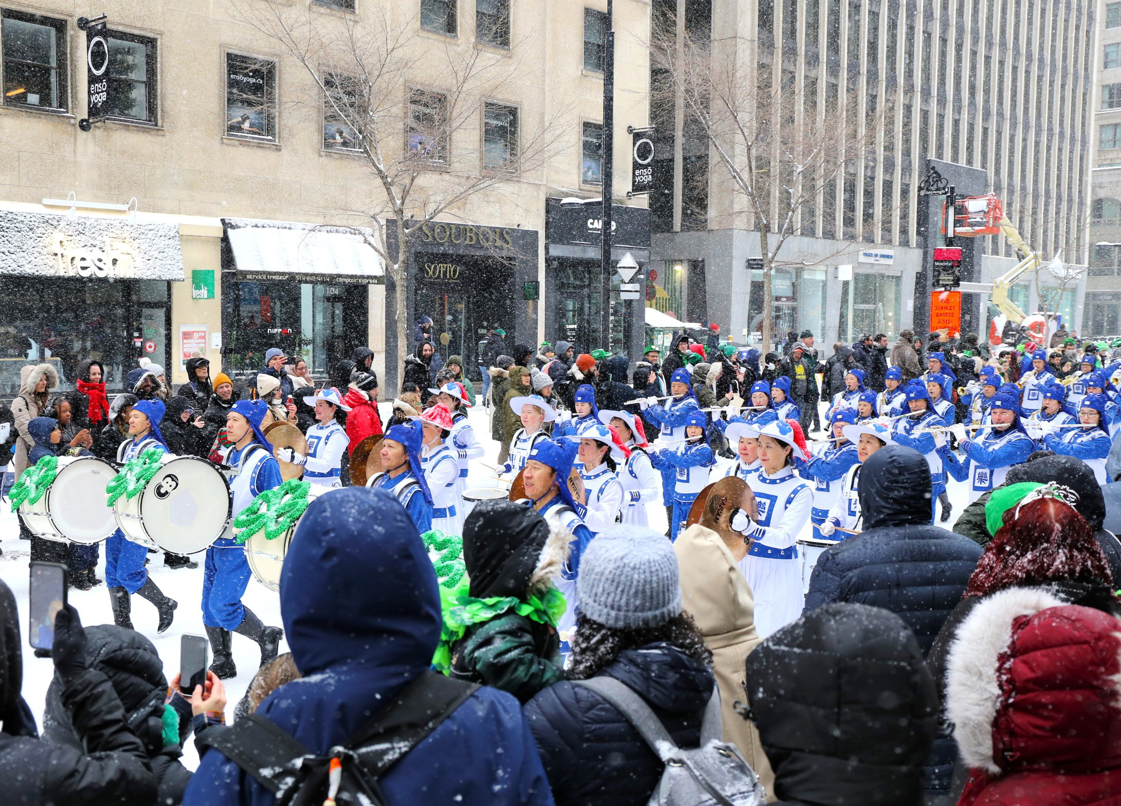 It snowed on the day of the parade, but the cold didn’t dampen people’s enthusiasm. Ninety-two floats, bands, and community groups started off at Fort Street and headed east along Maisonneuve Boulevard. Spectators along the route cheered and clapped. The crowd was often heard shouting “Falun Dafa” when the band marched by.