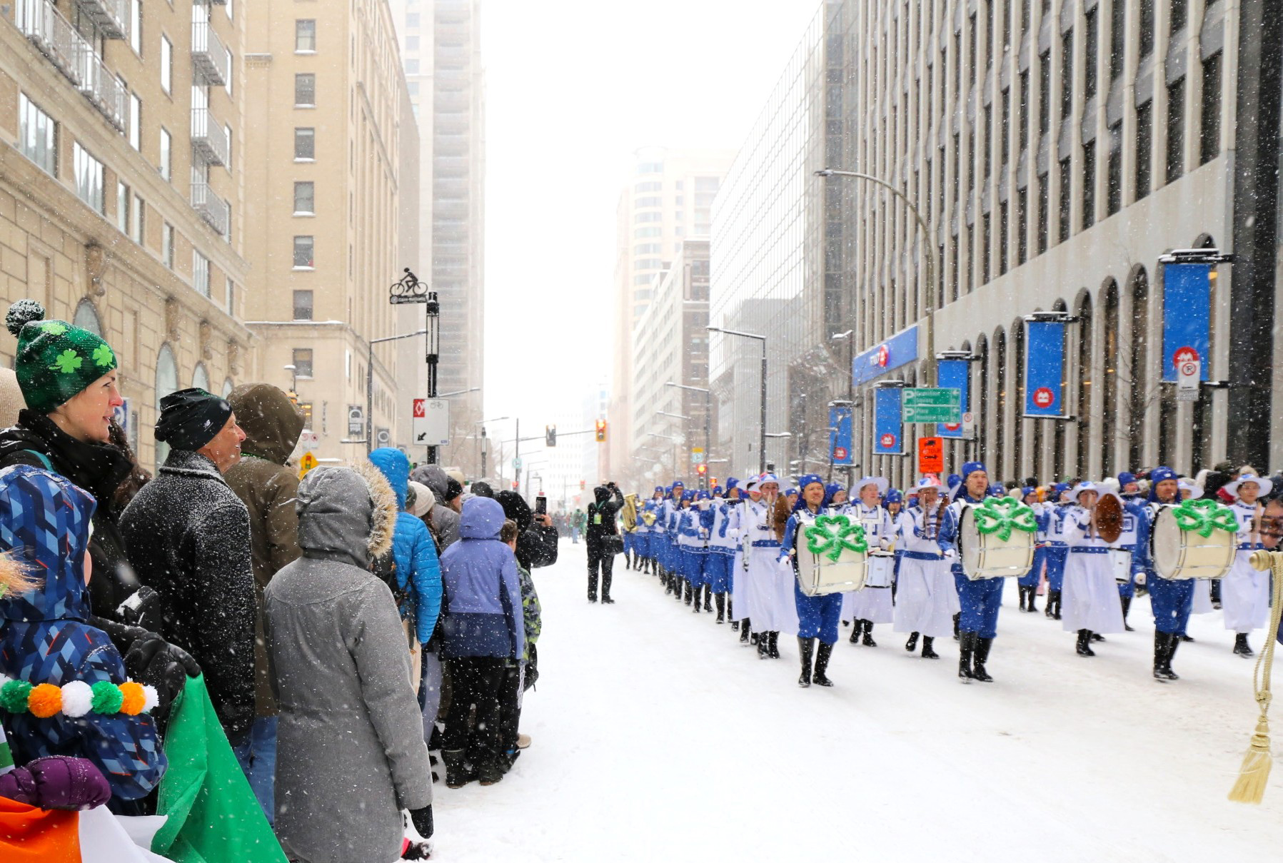 (Minghui.org) People enjoyed the Tian Guo Marching Band in Montreal’s 201st St. Patrick’s Day Parade on March 22, 2026. One spectator said that the band’s “Truthfulness-Compassion-Forbearance” message “is an inspiration for everyone.”